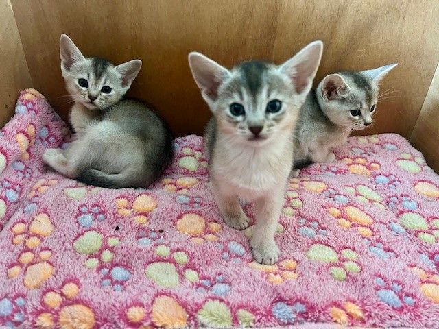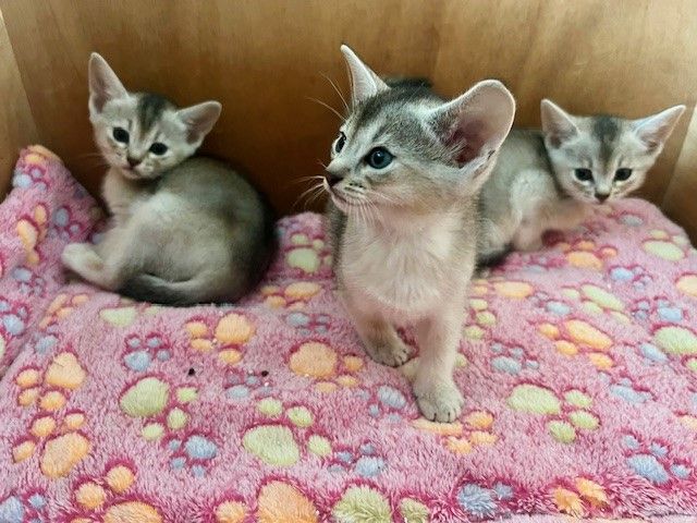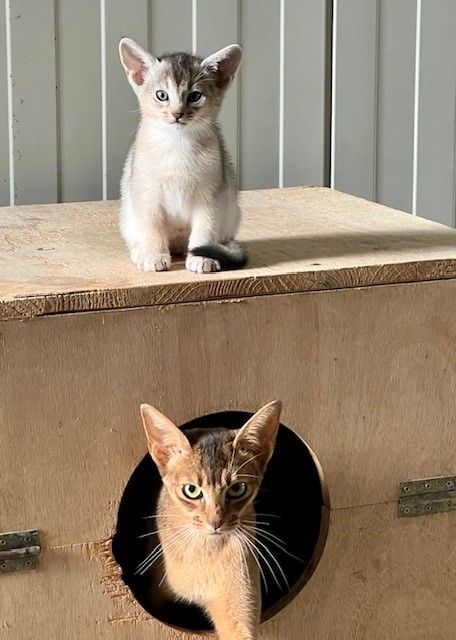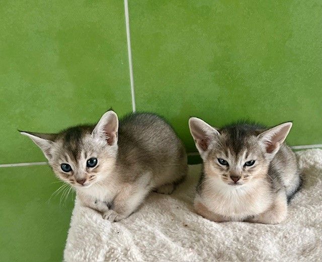 Wir freuen uns über fünf Kitten in der Farbe black-silver, zwei Kätzchen und drei Katerchen. Vaiana kümmert sich sehr gut um die Kleinen, diesmal wird sie von ihrer Abessinierfreundin Kemani unterstützt. Nachstehend sehen Sie Fotos der Kitten im Alter von sechs Wochen.