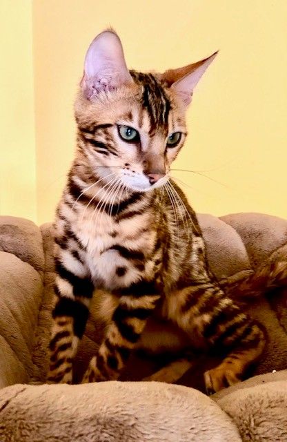 Da wir uns die Option nicht entgehen lassen wollten, dass bei uns nochmal melanistic farbene Kitten geboren werden, mussten wir auch von unserem schwarzen Kater Dark Spirit ein Mädel behalten. Unsere wunderschöne Malea brachte in ihrem letzten Wurf 2023 zwei tolle Mädels zur Welt, eine sehr dunkel und eine sehr warm orange, beide mit einer traumhaften Rosettenzeichnung. Wir entschieden uns für Nothing Else, die hellere der beiden Kätzchen, und das das eine gute Wahl war, bewies sie uns als sie im Juni 2024 wunderschöne Kitten von unserem Muffin geboren und sich super um die kleinen gekümmert hat.